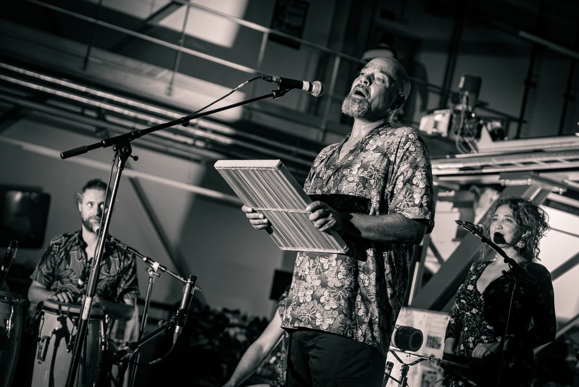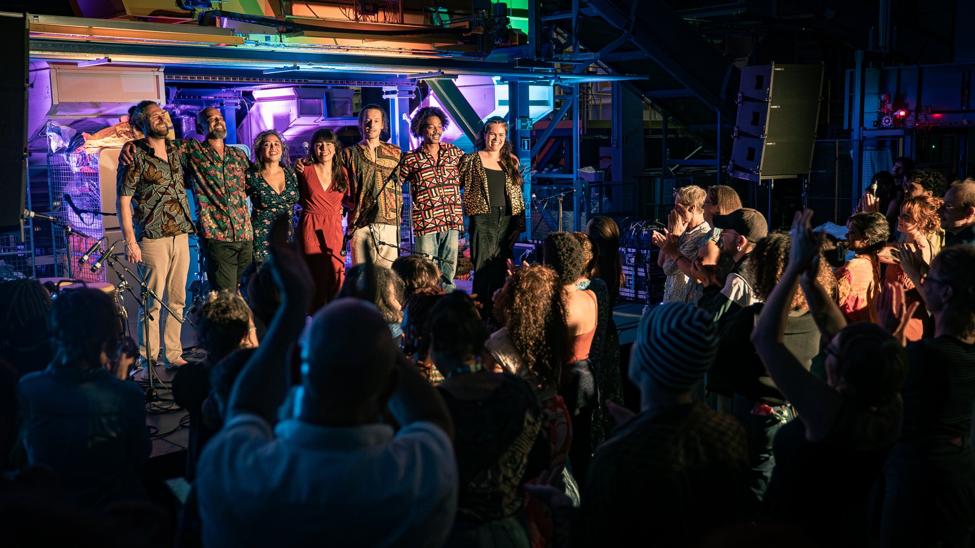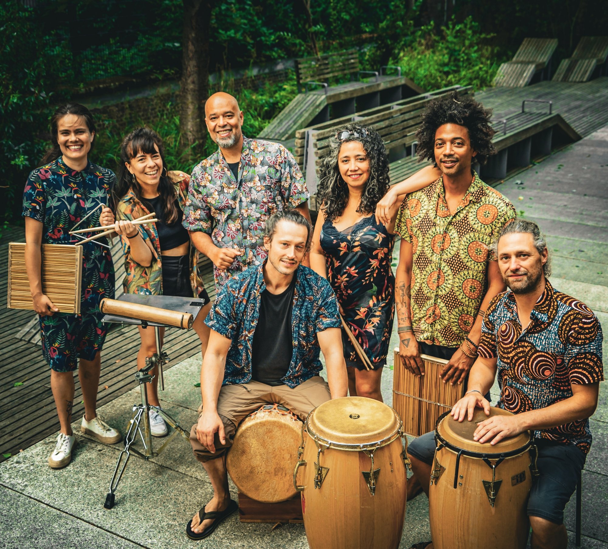 Autour de Jidé, s’assemble un collectif cosmopolite où chaque voix, chaque corps, chaque souffle vibre au son des percussions traditionnelles : Veronica Campos (Chili), Guillaume Codutti (Belgique), Romain Duyckaerts (Belgique), Camille Naples (Colombie) et Chaska Camargo (Pérou) forment une cellule rythmique puissante et sensible.